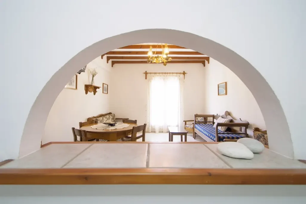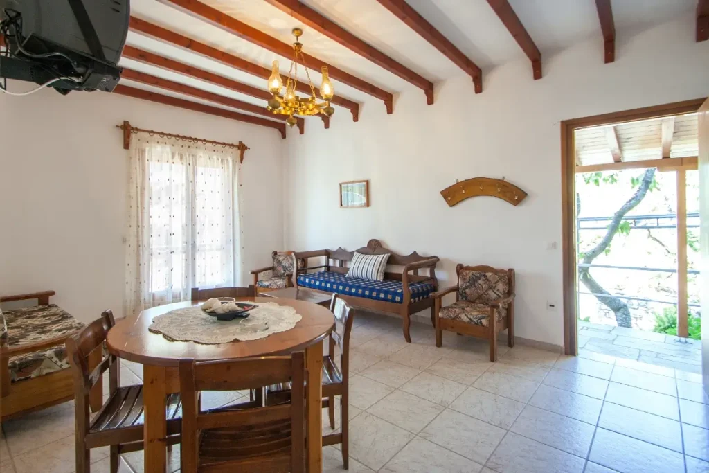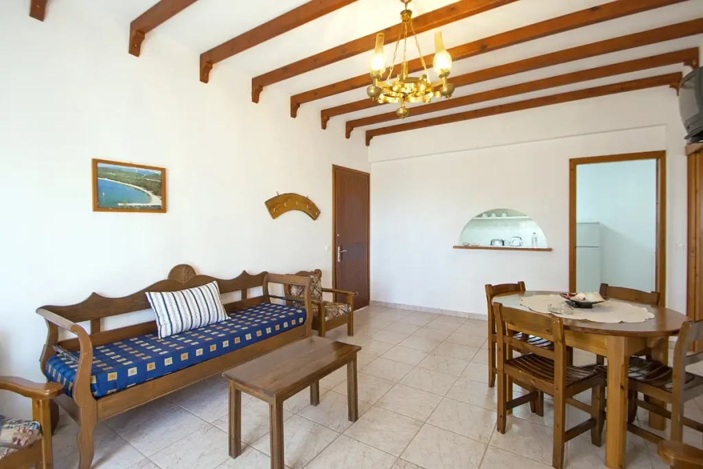 The Two-Bedroom Apartment at Angela Studios provides everything needed for a cozy and welcoming stay in Skiathos, fostering a home-like vibe. The kitchen is equipped with a hot plate, an electric kettle, and a toaster, while the bedroom offers comfortable beds for a good night’s rest.